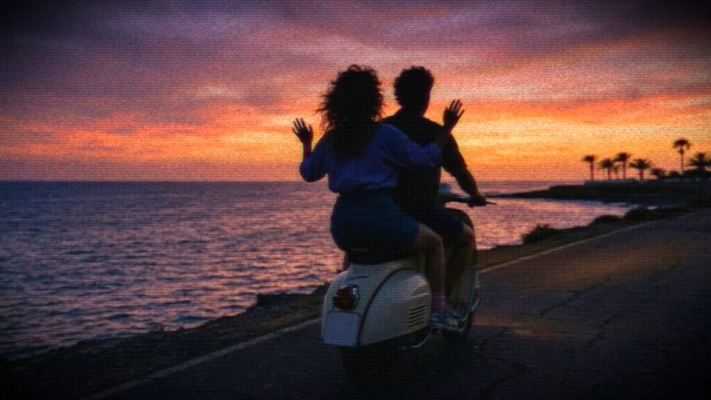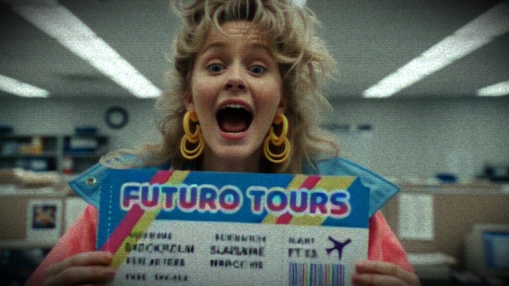 The escape begins with a sudden interruption of the grey. Two tickets from FUTURO TOURS, shimmering with a colorful spectrum of hope, act as a physical gateway to another reality. As the grainy VHS-effect of the city fades, the story shifts violently to the Canary Islands. The transition is a sensory shock: from the obsidian grey of a Swedish winter to the explosive saturated colors and sunset shades of a sun-drenched coastline.